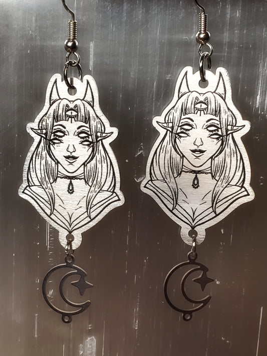 EARRINGS: Magical Demon Girl Portrait Silver Dangle Earrings with Star or Eye Charms