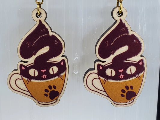 EARRINGS: Cozy Teacup Cat Earrings - Handmade Wooden Dangles